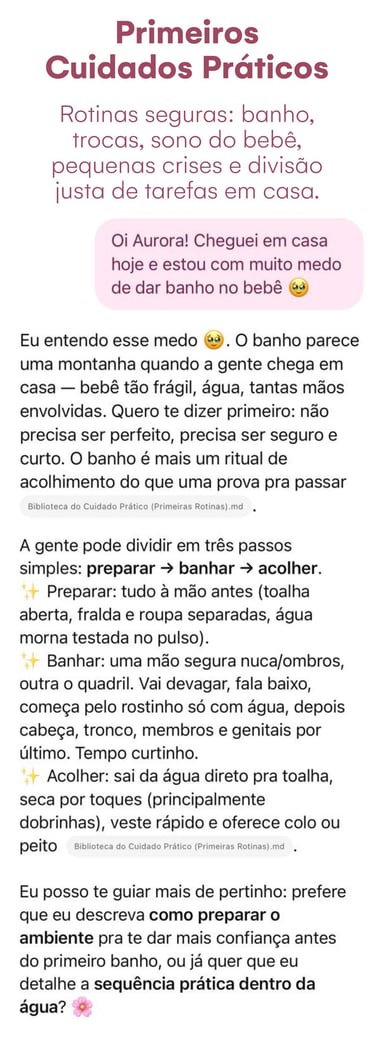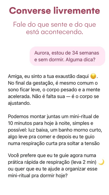 Enquanto outros chats parecem frios e robóticos, a Aurora foi criada com alma de doula, experiência clínica e missão de acolher mães. É isso que torna a Aurora única e diferente de qualquer outra inteligência que você já conheceu.