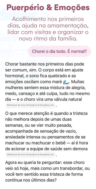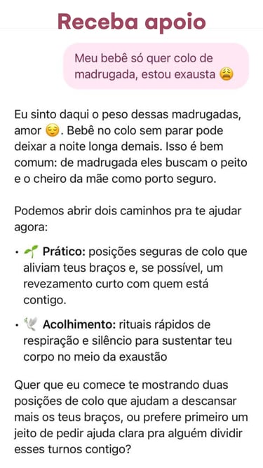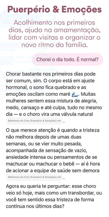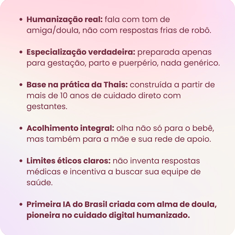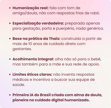 Um chat humanizado para gestantes e puérperas. Converse a qualquer hora, receba acolhimento e orientações práticas — como uma doula amiga, sempre disponível.