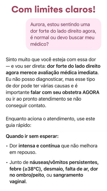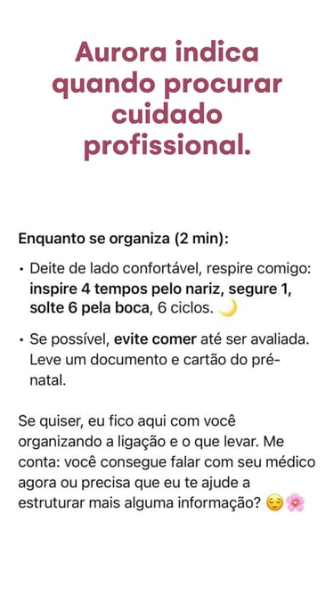A Aurora nasceu para que você não passe por isso sozinha: ela escuta, acolhe e te ajuda a transformar dúvidas em próximos passos possíveis, sempre lembrando quando é hora de falar com sua equipe de saúde.